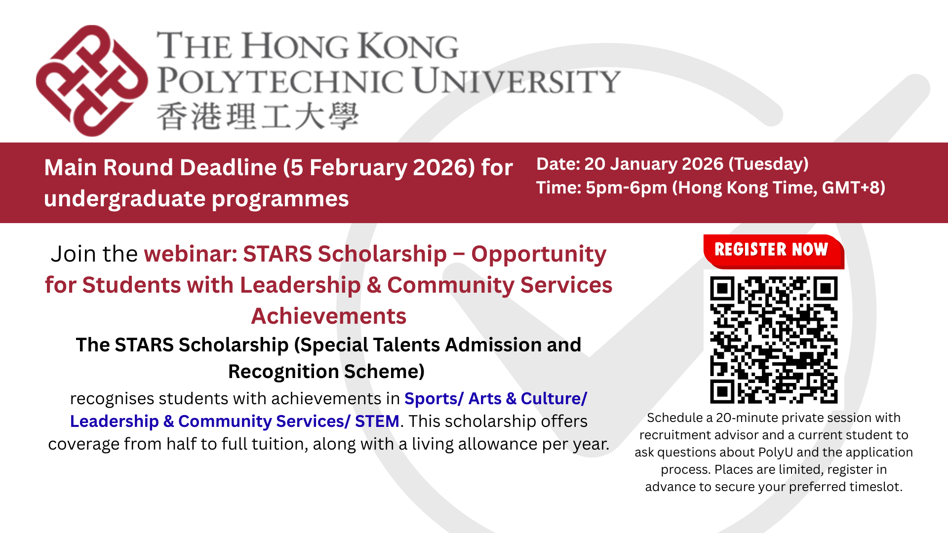 ประชาสัมพันธ์นักเรียน และผู้ปกครอง ลงทะเบียนเข้าร่วม webinar รับฟังข้อมูลทุนการศึกษา The Hong Kong Polytechnic University (PolyU)
