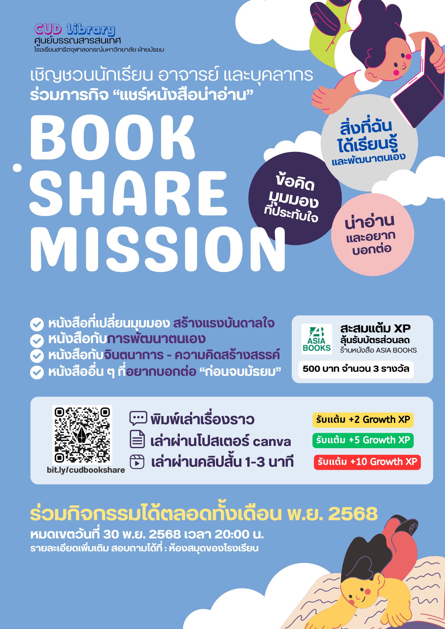 สามารถร่วมแชร์ได้ทั้งในรูปแบบ "พิมพ์ โปสเตอร์ภาพ หรือ วิดีโอสั้นเล่าเรื่อง" เพื่อสะสมแต้ม Growth XP "ยิ่งอ่าน ยิ่งเติบโต ยิ่งเรียนรู้" ลุ้นรับบัตรส่วนลด ร้านหนังสือ Asia Books มูลค่า 500 บาท จำนวน 3 รางวัล