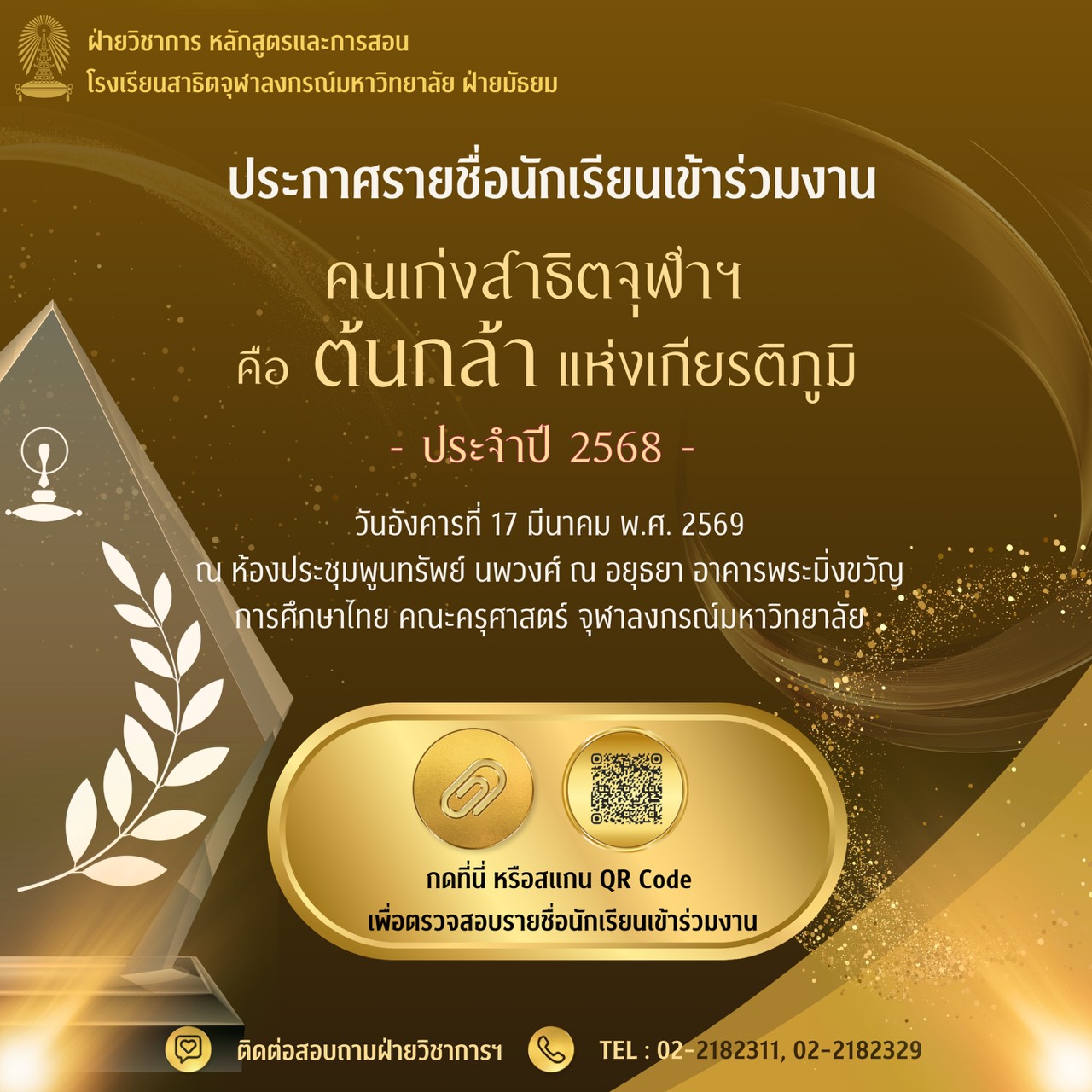 ประกาศรายชื่อนักเรียนเข้าร่วมงานคนเก่งสาธิตจุฬาฯ คือ ต้นกล้า แห่งเกียรติภูมิ ประจำปี 2568