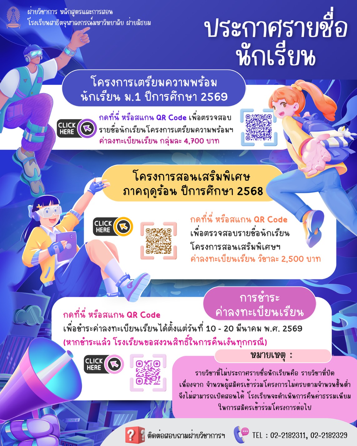 ประกาศรายชื่อนักเรียน เข้าร่วมโครงการเตรียมความพร้อม ม.1 และโครงการสอนเสริมภาคฤดูร้อน ปีการศึกษา 2569