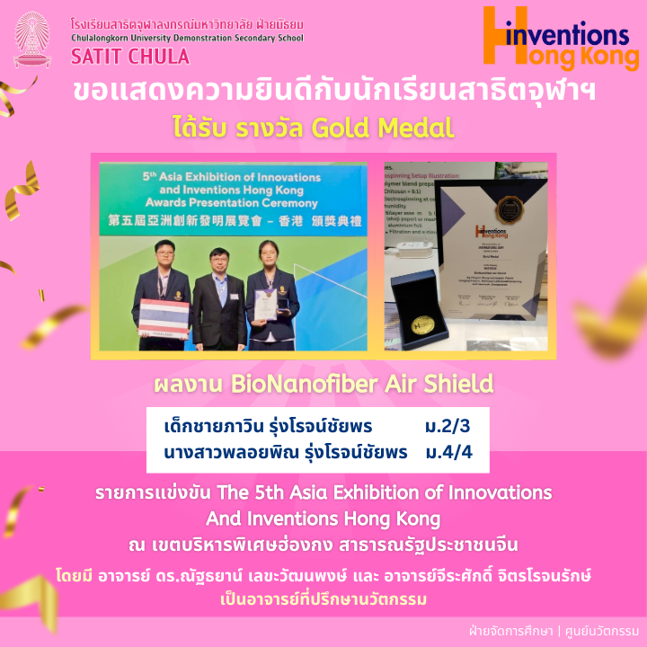 โรงเรียนสาธิตจุฬาลงกรณ์มหาวิทยาลัย ฝ่ายมัธยม ขอชื่นชมนักเรียนเจ้าของผลงาน BioNanofiber Air Shield ที่คว้ารางวัล Gold Medal จากเวที The 5th Asia Exhibition of Innovations and Inventions Hong Kong (Hinventions Hong Kong) ณ เขตบริหารพิเศษฮ่องกง สาธารณรัฐประชาชนจีน